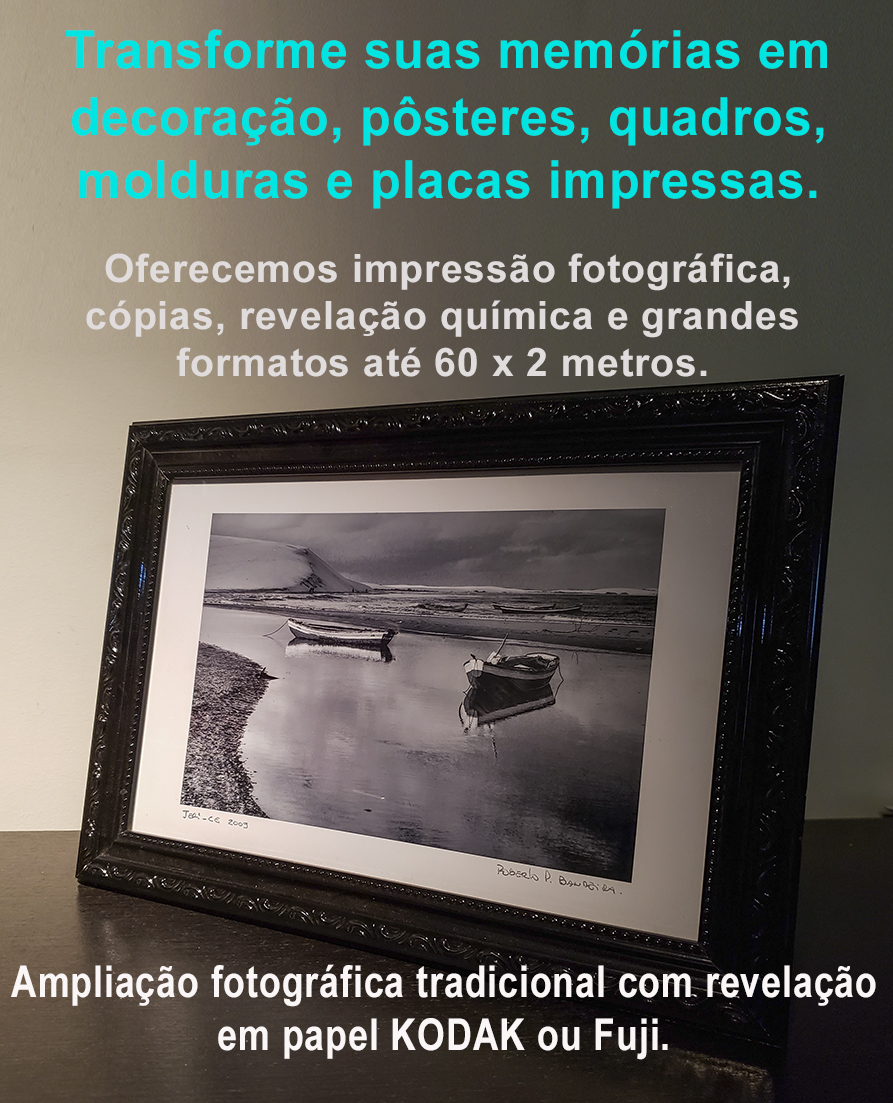 Ampliações produzidas com tecnologia fotográfica tradicional, em papel Kodak ou Fuji, com revelação química (C-Print).